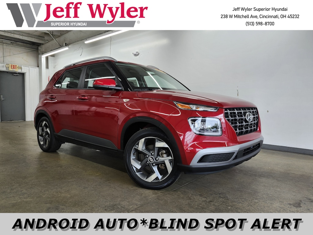 Jeff Wyler Superior Hyundai is honored to offer this charming 2022 Hyundai Venue Limited in Scarlet Red Pearl. Well equipped with: Cargo Package (Cargo Blocks, Cargo Net, and Cargo Tray), Option Group 01, 4-Wheel Disc Brakes, 6 Speakers, 6.483 Axle Ratio, 6.5J x 17" Alloy Wheels, ABS brakes, Air Conditioning, Alloy wheels, AM/FM radio: SiriusXM, Apple CarPlay & Android Auto, Auto High-beam Headlights, Automatic temperature control, Brake assist, Bumpers: body-color, Carpeted Floor Mats, Cloth Seat Trim, Delay-off headlights, Driver door bin, Driver vanity mirror, Dual front impact airbags, Dual front side impact airbags, Electronic Stability Control, Emergency communication system, First Aid Kit, Front anti-roll bar, Front Bucket Seats, Front Center Armrest, Front reading lights, Front wheel independent suspension, Fully automatic headlights, Heated door mirrors, Heated Front Bucket Seats, Heated front seats, Illuminated entry, Leather Shift Knob, Leather steering wheel, Low tire pressure warning, Navigation System, Occupant sensing airbag, Outside temperature display, Overhead airbag, Overhead console, Panic alarm, Passenger door bin, Passenger vanity mirror, Power door mirrors, Power steering, Power windows, Radio: AM/FM/HD/SiriusXM Display Audio, Rear Seat Cup Holder, Rear window defroster, Rear window wiper, Remote keyless entry, Roof rack: rails only, Security system, Speed control, Speed-sensing steering, Split folding rear seat, Spoiler, Steering wheel mounted audio controls, Tachometer, Telescoping steering wheel, Tilt steering wheel, Traction control, Trip computer, and Variably intermittent wipers. Clean CARFAX. This sales price excludes tax, title, and dealer fees. While every reasonable effort is made to ensure the accuracy of this information, we are not responsible for any errors or omissions contained on these pages. Used vehicles 10 years of age or newer with less than 100,000 miles are eligible for the Wyler Assurance Program, but eligible vehicles must pass our reconditioning process and multi-point inspection. Provided the vehicle passes inspection, vehicles will be eligible for the 6 month/6,000 mile limited warranty. The 6 month/6,000 mile limited warranty is NOT available on AS-IS vehicles, wholesale vehicles, lease buyback/pass-thru vehicles or un-inspected vehicles. Note that this program can also apply to vehicles where the remaining factory coverage is less than 6 months or 6,000 miles. Please check the Federal Trade Commission (FTC) Buyers guide on the vehicle for full details as to whether or not warranty coverage may apply. Contact Dealer for additional details. The Wyler Assurance 6 month/6,000 Mile limited warranty ends 6 months from the date of the Retail Purchase Agreement (BUYERS ORDER) or when the vehicle's odometer registers 6,000 additional miles to the mileage listed on the BUYERS ORDER, whichever comes first.Your Deductible - The warranty holder on your contract pays the first $100 of each covered repair.