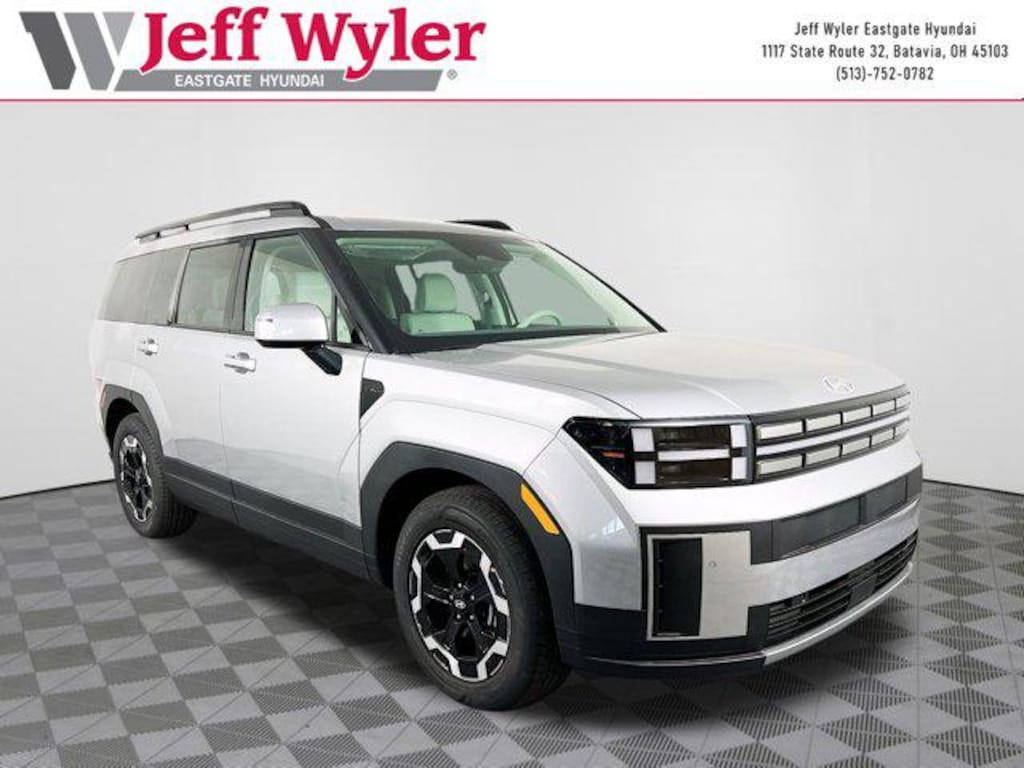 Priced below KBB Fair Purchase Price! Shimmering Silver Pearl 2025 Hyundai Santa Fe SEL 2.5L I4 AWD Shiftronic 20/28 City/Highway MPG Jeff Wyler Eastgate Auto Mall is delighted to offer this beautiful 2025 Hyundai Santa Fe SEL in Shimmering Silver Pearl. Well equipped with: Option Group 01, Tow & Go Package (Ball Mount Kit and Tow Hitch), 18" x 7.5J Alloy Wheels, 3rd row seats: bench, 4-Wheel Disc Brakes, 6 Speakers, ABS brakes, Air Conditioning, Alloy wheels, AM/FM radio: SiriusXM, Apple CarPlay & Android Auto, Auto High-beam Headlights, Automatic temperature control, Brake assist, Bumpers: body-color, Cargo Net, Carpeted Floor Mats, Delay-off headlights, Driver door bin, Driver vanity mirror, Dual front impact airbags, Dual front side impact airbags, Electronic Stability Control, Emergency communication system, Exterior Parking Camera Rear, First Aid Kit, Four wheel independent suspension, Front anti-roll bar, Front Bucket Seats, Front Center Armrest, Front dual zone A/C, Front reading lights, Fully automatic headlights, H-Tex Leatherette Seat Trim, Heated door mirrors, Heated Front Bucket Seats, Heated front seats, Illuminated entry, Knee airbag, Leather steering wheel, Low tire pressure warning, Occupant sensing airbag, Outside temperature display, Overhead airbag, Overhead console, Panic alarm, Passenger door bin, Passenger vanity mirror, Power door mirrors, Power driver seat, Power Liftgate, Power steering, Power windows, Radio: AM/FM/HD Display Audio, Rear anti-roll bar, Rear seat center armrest, Rear side impact airbag, Rear window defroster, Rear window wiper, Remote keyless entry, Security system, Speed control, Speed-sensing steering, Split folding rear seat, Spoiler, Steering wheel mounted audio controls, Tachometer, Telescoping steering wheel, Tilt steering wheel, Traction control, Trip computer, Turn signal indicator mirrors, and Variably intermittent wipers. 20/28 City/Highway MPG