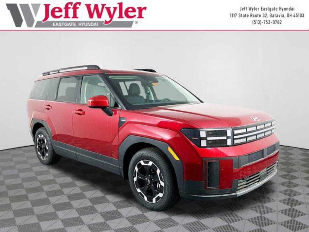 Ultimate Red 2025 Hyundai Santa Fe SEL 2.5L I4 AWD Shiftronic 20/28 City/Highway MPG Jeff Wyler Eastgate Auto Mall is very proud to offer this attractive 2025 Hyundai Santa Fe SEL in Ultimate Red. Well equipped with: Option Group 01, 18" x 7.5J Alloy Wheels, 3rd row seats: bench, 4-Wheel Disc Brakes, 6 Speakers, ABS brakes, Air Conditioning, Alloy wheels, AM/FM radio: SiriusXM, Apple CarPlay & Android Auto, Auto High-beam Headlights, Automatic temperature control, Brake assist, Bumpers: body-color, Cargo Cover, Cargo Net, Carpeted Floor Mats, Delay-off headlights, Driver door bin, Driver vanity mirror, Dual front impact airbags, Dual front side impact airbags, Electronic Stability Control, Emergency communication system, Exterior Parking Camera Rear, First Aid Kit, Four wheel independent suspension, Front anti-roll bar, Front Bucket Seats, Front Center Armrest, Front dual zone A/C, Front reading lights, Fully automatic headlights, H-Tex Leatherette Seat Trim, Heated door mirrors, Heated Front Bucket Seats, Heated front seats, Illuminated entry, Knee airbag, Leather steering wheel, Low tire pressure warning, Mudguards, Occupant sensing airbag, Outside temperature display, Overhead airbag, Overhead console, Panic alarm, Passenger door bin, Passenger vanity mirror, Power door mirrors, Power driver seat, Power Liftgate, Power steering, Power windows, Radio: AM/FM/HD Display Audio, Rear anti-roll bar, Rear seat center armrest, Rear side impact airbag, Rear window defroster, Rear window wiper, Remote keyless entry, Roadside Assistance Kit, Security system, Speed control, Speed-sensing steering, Split folding rear seat, Spoiler, Steering wheel mounted audio controls, Tachometer, Telescoping steering wheel, Tilt steering wheel, Traction control, Trip computer, Turn signal indicator mirrors, Variably intermittent wipers, and Wheel Locks. 20/28 City/Highway MPG