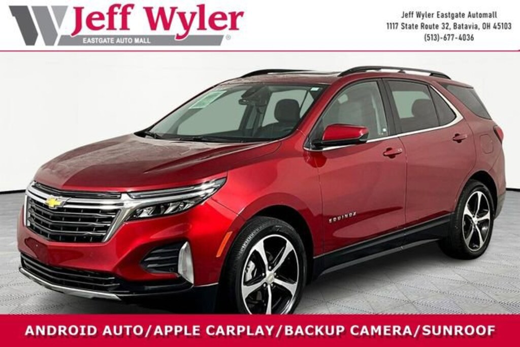 Jeff Wyler Eastgate Auto Mall is delighted to offer this attractive 2023 Chevrolet Equinox LT in Radiant Red Tintcoat. Well equipped with: Confidence & Convenience Package, Driver Confidence II Package (Front & Rear Park Assist), Driver Convenience Package (Dual-Zone Automatic Climate Control, Heated Driver & Front Passenger Seats, Rear Power Liftgate, Remote Start, and Wrapped Steering Wheel), Preferred Equipment Group 1LT, Side Blind Zone & Rear Cross Traffic (Lane Change Alert w/Side Blind Zone Alert and Rear Cross Traffic Alert), 17" Aluminum Wheels, 19" Aluminum Wheels, 2 Rear USB Charging-Only Ports, 2 USB Ports & Auxiliary Input Jack, 2-Way Power Driver Lumbar Control Seat Adjuster, 3.50 Final Drive Axle Ratio, 4-Wheel Disc Brakes, 6 Speakers, 6-Speaker Audio System Feature, ABS brakes, Air Conditioning, Alloy wheels, AM/FM radio: SiriusXM, Auto High-beam Headlights, Bluetooth® For Phone, Brake assist, Bumpers: body-color, Compass, Delay-off headlights, Driver 8-Way Power Seat Adjuster, Driver door bin, Driver vanity mirror, Dual front impact airbags, Dual front side impact airbags, Electronic Stability Control, Emergency communication system: OnStar and Chevrolet connected services capable, Four wheel independent suspension, Front anti-roll bar, Front Bucket Seats, Front Center Armrest, Front Passenger 4-Way Manual Seat Adjuster, Front reading lights, Fully automatic headlights, Heated door mirrors, Illuminated entry, Low tire pressure warning, Occupant sensing airbag, Outside temperature display, Overhead airbag, Overhead console, Panic alarm, Passenger door bin, Passenger vanity mirror, Power door mirrors, Power driver seat, Power steering, Power Sunroof, Power windows, Premium audio system: Chevrolet Infotainment 3, Premium Cloth Seat Trim, Radio data system, Radio: Chevrolet Infotainment 3 System w/AM/FM, Rear anti-roll bar, Rear reading lights, Rear seat center armrest, Rear window defroster, Rear window wiper, Remote keyless entry, Roof-Mounted Luggage Rack Side Rails, Security system, SiriusXM Radio, Speed control, Speed-sensing steering, Split folding rear seat, Spoiler, Steering wheel mounted audio controls, Tachometer, Telescoping steering wheel, Tilt steering wheel, Traction control, Trip computer, Variably intermittent wipers, Wheels: 19" Aluminum (LPO), and Wireless Apple CarPlay/Wireless Android Auto. CARFAX One-Owner. Clean CARFAX. Ask about available certifications. Used vehicles 10 years of age or newer with less than 100,000 miles are eligible for the Wyler Assurance Program, but eligible vehicles must pass our reconditioning process and multi-point inspection. Provided the vehicle passes inspection, vehicles will be eligible for the 6 month/6,000 mile limited warranty. The 6 month/6,000 mile limited warranty is NOT available on AS-IS vehicles, wholesale vehicles, lease buyback/pass-thru vehicles or un-inspected vehicles. Note that this program can also apply to vehicles where the remaining factory coverage is less than 6 months or 6,000 miles. Please check the Federal Trade Commission (FTC) Buyers guide on the vehicle for full details as to whether or not warranty coverage may apply. Contact Dealer for additional details. The Wyler Assurance 6 month/6,000 Mile limited warranty ends 6 months from the date of the Retail Purchase Agreement (BUYERS ORDER) or when the vehicle's odometer registers 6,000 additional miles to the mileage listed on the BUYERS ORDER, whichever comes first. Your Deductible - The warranty holder on your contract pays the first $100 of each covered repair.