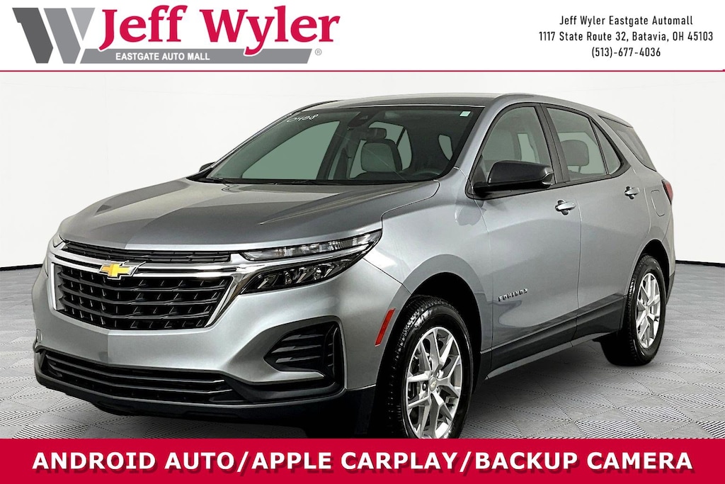 Jeff Wyler Eastgate Auto Mall is honored to offer this attractive-looking 2023 Chevrolet Equinox LS in Sterling Gray Metallic. Well equipped with: Preferred Equipment Group 1LS, 17" Aluminum Wheels, 2 Rear USB Charging-Only Ports, 2 USB Ports & Auxiliary Input Jack, 3.87 Final Drive Axle Ratio, 4-Wheel Disc Brakes, 6 Speakers, 6-Speaker Audio System Feature, ABS brakes, Air Conditioning, Alloy wheels, AM/FM radio: SiriusXM, Auto High-beam Headlights, Bluetooth® For Phone, Brake assist, Bumpers: body-color, Compass, Delay-off headlights, Driver 4-Way Manual Seat Adjuster, Driver door bin, Driver vanity mirror, Dual front impact airbags, Dual front side impact airbags, Electronic Stability Control, Emergency communication system: OnStar and Chevrolet connected services capable, Four wheel independent suspension, Front anti-roll bar, Front Bucket Seats, Front Center Armrest, Front Passenger 4-Way Manual Seat Adjuster, Front reading lights, Fully automatic headlights, Heated door mirrors, Illuminated entry, Low tire pressure warning, Occupant sensing airbag, Outside temperature display, Overhead airbag, Overhead console, Panic alarm, Passenger door bin, Passenger vanity mirror, Power door mirrors, Power steering, Power windows, Premium audio system: Chevrolet Infotainment 3, Premium Cloth Seat Trim, Radio data system, Radio: Chevrolet Infotainment 3 System w/AM/FM, Rear anti-roll bar, Rear reading lights, Rear seat center armrest, Rear window defroster, Rear window wiper, Remote keyless entry, Security system, SiriusXM Radio, Speed control, Speed-sensing steering, Split folding rear seat, Spoiler, Steering wheel mounted audio controls, Tachometer, Telescoping steering wheel, Tilt steering wheel, Traction control, Trip computer, Variably intermittent wipers, and Wireless Apple CarPlay/Wireless Android Auto. CARFAX One-Owner. Clean CARFAX. Ask about available certifications. Used vehicles 10 years of age or newer with less than 100,000 miles are eligible for the Wyler Assurance Program, but eligible vehicles must pass our reconditioning process and multi-point inspection. Provided the vehicle passes inspection, vehicles will be eligible for the 6 month/6,000 mile limited warranty. The 6 month/6,000 mile limited warranty is NOT available on AS-IS vehicles, wholesale vehicles, lease buyback/pass-thru vehicles or un-inspected vehicles. Note that this program can also apply to vehicles where the remaining factory coverage is less than 6 months or 6,000 miles. Please check the Federal Trade Commission (FTC) Buyers guide on the vehicle for full details as to whether or not warranty coverage may apply. Contact Dealer for additional details. The Wyler Assurance 6 month/6,000 Mile limited warranty ends 6 months from the date of the Retail Purchase Agreement (BUYERS ORDER) or when the vehicle's odometer registers 6,000 additional miles to the mileage listed on the BUYERS ORDER, whichever comes first. Your Deductible - The warranty holder on your contract pays the first $100 of each covered repair.