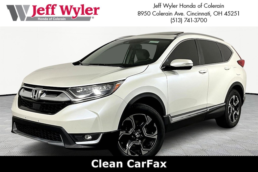 Jeff Wyler Honda of Colerain is very proud to offer this beautiful 2017 Honda CR-V Touring in White Diamond Pearl. Well equipped with: 18" Alloy Wheels, 4-Wheel Disc Brakes, 5.64 Axle Ratio, 9 Speakers, ABS brakes, Air Conditioning, Alloy wheels, AM/FM radio: SiriusXM, Apple CarPlay/Android Auto, Auto High-beam Headlights, Auto-dimming Rear-View mirror, Automatic temperature control, Blind Spot Information (BSI) System warning, Brake assist, Bumpers: body-color, Compass, Delay-off headlights, Driver door bin, Driver vanity mirror, Dual front impact airbags, Dual front side impact airbags, Electronic Stability Control, Exterior Parking Camera Rear, Four wheel independent suspension, Front anti-roll bar, Front Bucket Seats, Front Center Armrest, Front dual zone A/C, Front fog lights, Front reading lights, Fully automatic headlights, Garage door transmitter: HomeLink, Heated door mirrors, Heated Front Bucket Seats, Heated front seats, Illuminated entry, Leather Seat Trim, Leather Shift Knob, Low tire pressure warning, Memory seat, Navigation System, Occupant sensing airbag, Outside temperature display, Overhead airbag, Overhead console, Panic alarm, Passenger door bin, Passenger vanity mirror, Power door mirrors, Power driver seat, Power Liftgate, Power moonroof, Power passenger seat, Power steering, Power windows, Radio data system, Radio: AM/FM/HD/SiriusXM Audio System, Rain sensing wipers, Rear anti-roll bar, Rear seat center armrest, Rear window defroster, Rear window wiper, Remote keyless entry, Roof rack: rails only, Security system, Speed control, Speed-sensing steering, Speed-Sensitive Wipers, Split folding rear seat, Spoiler, Steering wheel mounted audio controls, Tachometer, Telescoping steering wheel, Tilt steering wheel, Traction control, Trip computer, Turn signal indicator mirrors, and Variably intermittent wipers.