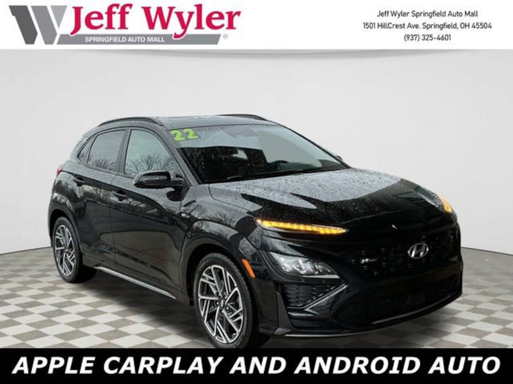 Jeff Wyler Springfield Auto Mall is pumped up to offer this attractive 2022 Hyundai Kona N Line in Ultra Black Pearl. Well equipped with: Tech Package (Electric Parking Brake, High Beam Assist, Hyundai Highway Driving Assist 1, LED Headlights, LED Taillights, Option Group 03, Power Sunroof, Radio: Harman Kardon Premium Audio System, and Smart Cruise Control w/Stop & Go), 3.174 Axle Ratio, 4-Wheel Disc Brakes, 6 Speakers, ABS brakes, Air Conditioning, Alloy wheels, AM/FM radio: SiriusXM, Apple CarPlay & Android Auto, Automatic temperature control, Brake assist, Bumpers: body-color, Cargo Net, Cargo Tray, Carpeted Floor Mats, Delay-off headlights, Driver door bin, Driver vanity mirror, Dual front impact airbags, Dual front side impact airbags, Electronic Stability Control, Emergency communication system: Blue Link Connected Car Service (3-year complimentary subscription), Exterior Parking Camera Rear, First Aid Kit, Four wheel independent suspension, Front anti-roll bar, Front Bucket Seats, Front Center Armrest, Front reading lights, Fully automatic headlights, Heated door mirrors, Heated Front Bucket Seats, Heated front seats, Illuminated entry, Leather Shift Knob, Leather steering wheel, Low tire pressure warning, Occupant sensing airbag, Overhead airbag, Overhead console, Panic alarm, Passenger door bin, Passenger vanity mirror, Power door mirrors, Power driver seat, Power steering, Power windows, Radio: AM/FM/HD Radio/SiriusXM Audio System, Rear anti-roll bar, Rear Bumper Applique, Rear seat center armrest, Rear window defroster, Rear window wiper, Remote keyless entry, Security system, Speed control, Speed-sensing steering, Split folding rear seat, Spoiler, Sport Cloth Seat Trim, Steering wheel mounted audio controls, Tachometer, Telescoping steering wheel, Tilt steering wheel, Traction control, Trip computer, Turn signal indicator mirrors, Variably intermittent wipers, and Wheels: 18 x 7.5J Alloy. Ask about available certifications. Used vehicles 10 years of age or newer with less than 100,000 miles are eligible for the Wyler Assurance Program, but eligible vehicles must pass our reconditioning process and multi-point inspection. Provided the vehicle passes inspection, vehicles will be eligible for the 6 month/6,000 mile limited warranty. The 6 month/6,000 mile limited warranty is NOT available on AS-IS vehicles, wholesale vehicles, lease buyback/pass-thru vehicles or un-inspected vehicles. Note that this program can also apply to vehicles where the remaining factory coverage is less than 6 months or 6,000 miles. Please check the Federal Trade Commission (FTC) Buyers guide on the vehicle for full details as to whether or not warranty coverage may apply. Contact Dealer for additional details. The Wyler Assurance 6 month/6,000 Mile limited warranty ends 6 months from the date of the Retail Purchase Agreement (BUYERS ORDER) or when the vehicle's odometer registers 6,000 additional miles to the mileage listed on the BUYERS ORDER, whichever comes first. Your Deductible - The warranty holder on your contract pays the first $100 of each covered repair.