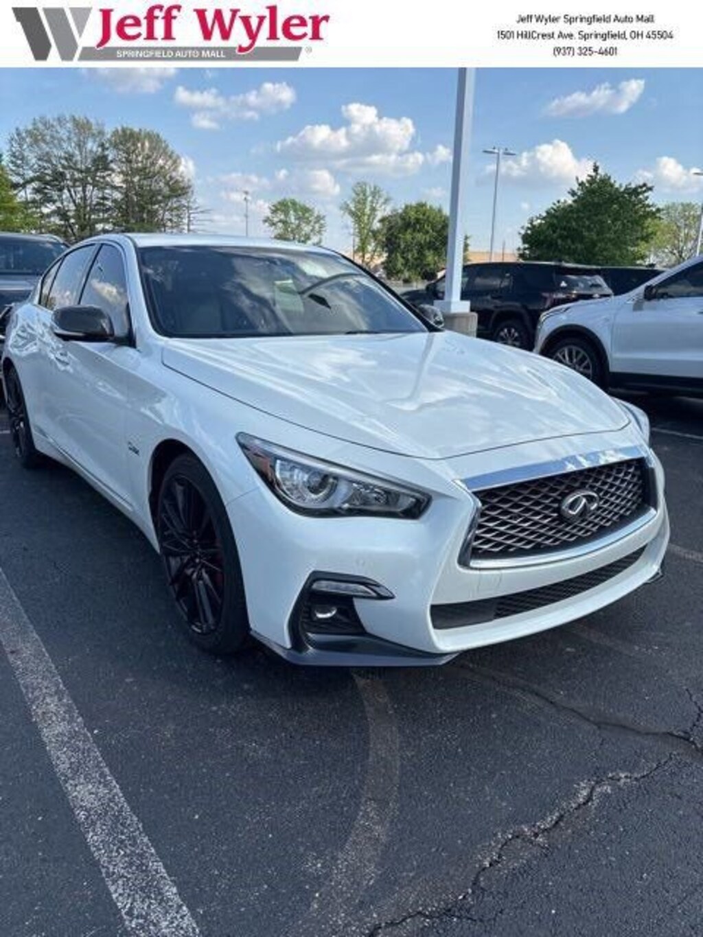 Jeff Wyler Springfield Auto Mall is pumped up to offer this great-looking 2020 INFINITI Q50 Red Sport 400 in Majestic White. Well equipped with: Carbon Fiber Package (Carbon Fiber Mirror Covers), Cargo Package (Cargo Net, First Aid Kit, Shopping Bag Hooks, and Trunk Mat), ProACTIVE Package (Adaptive Front Lighting System, Blind-Spot Intervention (BSI), Direct Adaptive Steering, Distance Control Assist, ECO Pedal, Front Seat Pre-Crash Seat Belts, High Beam Assist (HBA), Intelligent Cruise Control, and Lane Departure Prevention (LDP)), 16 Speakers, 4-Wheel Disc Brakes, ABS brakes, Adaptive suspension, Air Conditioning, Alloy wheels, AM/FM radio: SiriusXM, Apple CarPlay/Android Auto, Auto tilt-away steering wheel, Auto-dimming door mirrors, Auto-dimming Rear-View mirror, Automatic temperature control, Blind Spot Warning, Brake assist, Bumpers: body-color, CD player, Compass, Delay-off headlights, Driver door bin, Driver vanity mirror, Dual front impact airbags, Dual front side impact airbags, Electronic Stability Control, Emergency communication system: INFINITI Connection, Four wheel independent suspension, Front anti-roll bar, Front Bucket Seats, Front Center Armrest, Front dual zone A/C, Front fog lights, Front reading lights, Fully automatic headlights, Garage door transmitter: HomeLink, Heated door mirrors, Heated front seats, Heated Front Sport Seats, Heated steering wheel, Illuminated entry, INFINITI Radiant Grille Emblem, INFINITI Radiant Welcome Lighting, Leather Shift Knob, Leather steering wheel, Literature Kit, Low tire pressure warning, Memory seat, Navigation system: INFINITI InTouch Navigation, Occupant sensing airbag, Outside temperature display, Overhead airbag, Overhead console, Panic alarm, Passenger door bin, Passenger vanity mirror, Power door mirrors, Power driver seat, Power moonroof, Power passenger seat, Power steering, Power windows, Premium Paint, Quilted Semi-Aniline Leather Seating Surfaces, Radio data system, Radio: INFINITI InTouch w/Navigation, Rain sensing wipers, Rear anti-roll bar, Rear reading lights, Rear seat center armrest, Rear USB Charging Ports, Rear window defroster, Remote keyless entry, Security system, Speed control, Speed-Sensitive Wipers, Split folding rear seat, Steering wheel memory, Steering wheel mounted audio controls, Tachometer, Telescoping steering wheel, Tilt steering wheel, Traction control, Trip computer, Turn signal indicator mirrors, Variably intermittent wipers, and Wheels: 19" x 9" Aluminum-Alloy Sport. Ask about available certifications. Used vehicles 10 years of age or newer with less than 100,000 miles are eligible for the Wyler Assurance Program, but eligible vehicles must pass our reconditioning process and multi-point inspection. Provided the vehicle passes inspection, vehicles will be eligible for the 6 month/6,000 mile limited warranty. The 6 month/6,000 mile limited warranty is NOT available on AS-IS vehicles, wholesale vehicles, lease buyback/pass-thru vehicles or un-inspected vehicles. Note that this program can also apply to vehicles where the remaining factory coverage is less than 6 months or 6,000 miles. Please check the Federal Trade Commission (FTC) Buyers guide on the vehicle for full details as to whether or not warranty coverage may apply. Contact Dealer for additional details. The Wyler Assurance 6 month/6,000 Mile limited warranty ends 6 months from the date of the Retail Purchase Agreement (BUYERS ORDER) or when the vehicle's odometer registers 6,000 additional miles to the mileage listed on the BUYERS ORDER, whichever comes first. Your Deductible - The warranty holder on your contract pays the first $100 of each covered repair.