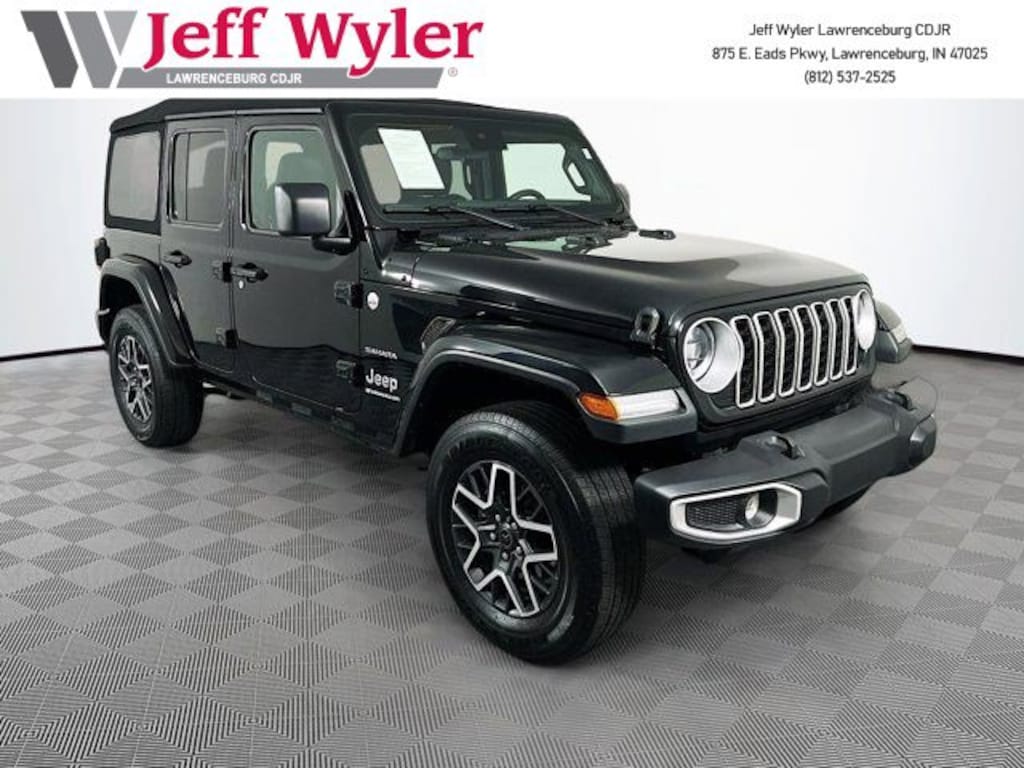 Jeff Wyler Chrysler Dodge Jeep of Lawrenceburg is delighted to offer this fantastic-looking and fun 2024 Jeep Wrangler Sahara in Black Clearcoat. Quick Order Package 24G Sahara, Smoker's Group (Cigar Lighter and Removable Ash Tray), 110 MPH Vehicle Max Speed Calibration, 12.3" Touchscreen Display, 3.45 Overall Top Gear Ratio, 4-Wheel Disc Brakes, 8 Speakers, ABS brakes, Air Conditioning, Alloy wheels, AM/FM radio: SiriusXM, Apple CarPlay, Apple CarPlay/Android Auto, Automatic temperature control, Aux Battery, Brake assist, Cloth Low-Back Bucket Seats, Compass, Connectivity - US/Canada, Delay-off headlights, Disassociated Touchscreen Display, Driver door bin, Driver vanity mirror, Dual front impact airbags, Dual front side impact airbags, Electronic Stability Control, Emergency communication system: Jeep Connect, Front anti-roll bar, Front Bucket Seats, Front Center Armrest w/Storage, Front dual zone A/C, Front fog lights, Front reading lights, Fully automatic headlights, Google Android Auto, Heated door mirrors, Heated front seats, Heated steering wheel, Heavy Duty Suspension w/Gas Shocks, Illuminated entry, Integrated Center Stack Radio, Integrated roll-over protection, Integrated Voice Command w/Bluetooth, Low tire pressure warning, Non-Lock Fuel Cap w/o Discriminator, Occupant sensing airbag, Outside temperature display, Overhead airbag, Panic alarm, ParkView Rear Back-Up Camera, Passenger door bin, Passenger vanity mirror, Power door mirrors, Power steering, Power windows, Radio data system, Radio: Uconnect 5 w/12.3" Display, Rear anti-roll bar, Rear reading lights, Remote keyless entry, Security system, Speed control, Split folding rear seat, Steering wheel mounted audio controls, Stop-Start Dual Battery System, Tachometer, Telescoping steering wheel, Tilt steering wheel, Traction control, Trip computer, Variably intermittent wipers, Voltmeter, and Wheels: 18" x 7.5" Machine/Painted Gray Our PRE-OWNED vehicles are put through a rigorous 167- POINT QUALITY ASSURANCE INSPECTION along with an average amount of over $1,400.00 SPENT to recondition each vehicle so we can be sure to deliver you the highest quality vehicle like you deserve! ***ONLINE PRICE DOES NOT INCLUDE WYLER FAMILY FIRST PACKAGE*** Stop by 4136 Shelbyville Road to see for yourself, or give us a call @ 502-897-3151 to schedule your test drive! Ask about available certifications.