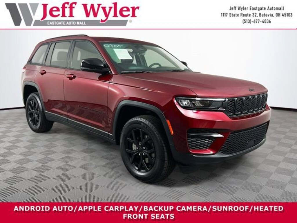 Jeff Wyler Eastgate Auto Mall is proud to offer this beautiful 2025 Jeep Grand Cherokee Altitude X in Velvet Red Pearlcoat. Well equipped with: ABS brakes, Alloy wheels, Compass, Electronic Stability Control, Emergency communication system, Front dual zone A/C, Heated door mirrors, Illuminated entry, Low tire pressure warning, ParkView Rear Back-Up Camera, Remote keyless entry, Traction control, 4-Wheel Disc Brakes, 6 Speakers, Air Conditioning, AM/FM radio: SiriusXM, Anti-whiplash front head restraints, Automatic temperature control, Brake assist, Bumpers: body-color, Cloth Seats, Delay-off headlights, Driver door bin, Driver vanity mirror, Dual front impact airbags, Dual front side impact airbags, Four wheel independent suspension, Front anti-roll bar, Front Bucket Seats, Front Center Armrest w/Storage, Front reading lights, Fully automatic headlights, Knee airbag, Normal Duty Suspension, Occupant sensing airbag, Outside temperature display, Overhead airbag, Overhead console, Panic alarm, Passenger door bin, Passenger vanity mirror, Power door mirrors, Power driver seat, Power steering, Power windows, Radio data system, Radio: Uconnect 5 with 8.4 Display, Rear anti-roll bar, Rear reading lights, Rear window defroster, Rear window wiper, Security system, Speed control, Speed-Sensitive Wipers, Split folding rear seat, Spoiler, Steering wheel mounted audio controls, Tachometer, Telescoping steering wheel, Tilt steering wheel, Trip computer, Variably intermittent wipers, Voltmeter, and Wheels: 17 x 6.5 Fully Painted Aluminum. CARFAX One-Owner. Clean CARFAX. Ask about available certifications. Used vehicles 10 years of age or newer with less than 100,000 miles are eligible for the Wyler Assurance Program, but eligible vehicles must pass our reconditioning process and multi-point inspection. Provided the vehicle passes inspection, vehicles will be eligible for the 6 month/6,000 mile limited warranty. The 6 month/6,000 mile limited warranty is NOT available on AS-IS vehicles, wholesale vehicles, lease buyback/pass-thru vehicles or un-inspected vehicles. Note that this program can also apply to vehicles where the remaining factory coverage is less than 6 months or 6,000 miles. Please check the Federal Trade Commission (FTC) Buyers guide on the vehicle for full details as to whether or not warranty coverage may apply. Contact Dealer for additional details. The Wyler Assurance 6 month/6,000 Mile limited warranty ends 6 months from the date of the Retail Purchase Agreement (BUYERS ORDER) or when the vehicle's odometer registers 6,000 additional miles to the mileage listed on the BUYERS ORDER, whichever comes first. Your Deductible - The warranty holder on your contract pays the first $100 of each covered repair.