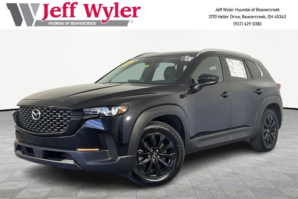 CARFAX One-Owner. Clean CARFAX. Jeff Wyler Hyundai of Beavercreek is pleased to offer this good-looking 2023 Mazda CX-50 2.5 S Preferred Plus Package in Jet Black Mica. Well equipped with: Weather Package (Cargo Liner w/Seatback Protection), 4-Wheel Disc Brakes, 4.367 Axle Ratio, 8 Speakers, ABS brakes, Air Conditioning, Alloy wheels, AM/FM radio, AppLink/Apple CarPlay and Android Auto, Auto High-beam Headlights, Automatic temperature control, Black Lug Nuts & Black Wheel Locks, Brake assist, Bumpers: body-color, Delay-off headlights, Driver door bin, Driver vanity mirror, Dual front impact airbags, Dual front side impact airbags, Electronic Stability Control, Emergency communication system: MAZDA CONNECT, Exterior Parking Camera Rear, Front anti-roll bar, Front Bucket Seats, Front Center Armrest w/Storage, Front dual zone A/C, Front reading lights, Front wheel independent suspension, Fully automatic headlights, Half Leatherette Seat Trim, Heated door mirrors, Heated Front Bucket Seats, Heated front seats, Illuminated entry, Knee airbag, Leather Shift Knob, Leather steering wheel, Low tire pressure warning, Occupant sensing airbag, Outside temperature display, Overhead airbag, Overhead console, Panic alarm, Passenger door bin, Passenger vanity mirror, Power door mirrors, Power driver seat, Power Liftgate, Power moonroof, Power steering, Power windows, Radio data system, Radio: AM/FM/HD Audio System, Rain sensing wipers, Rear seat center armrest, Rear window defroster, Rear window wiper, Remote keyless entry, Retractable Cargo Cover, Speed control, Speed-sensing steering, Split folding rear seat, Spoiler, Steering wheel mounted audio controls, Tachometer, Telescoping steering wheel, Tilt steering wheel, Traction control, Trip computer, Turn signal indicator mirrors, Variably intermittent wipers, and Wheels: 17" x 7J Aluminum Alloy.Come see the excitement at Jeff Wyler Hyundai of Beavercreek! Visit us online at www.jeffwylerhyundaiofbeavercreek.com Proudly Serving: Cincinnati, Dayton, Centeville, Ketttering, Moraine,Beavercreek, Xenia,Oakwood, Trotwood, Vandalia, Kettering, Wright Patterson, Riverside, Engelwood, Miamisburg, Huber Heights, Springboro, Brookville, Fairborn, West Carrollton, Yellow Springs, Bellbrook, Springfield Columbus, Hamilton, West Chester, Monroe, Fairfield. PROUDLY SERVING: CINCINNATI, DAYTON,COLUMBUS, LOUISVILLE, LEXINGTON, INDIANAPOLIS,HAMILTON, FLORENCE, ALEXANDRIA, BEAVERCREEK, SPRINGDALE, WEST CHESTER, MONROE, FAIRFIELD, KENWOOD, NEWPORT AND ALL OF GREATER CINCINNATI OHIO, INDIANA, AND NORTHERN KENTUCKY.