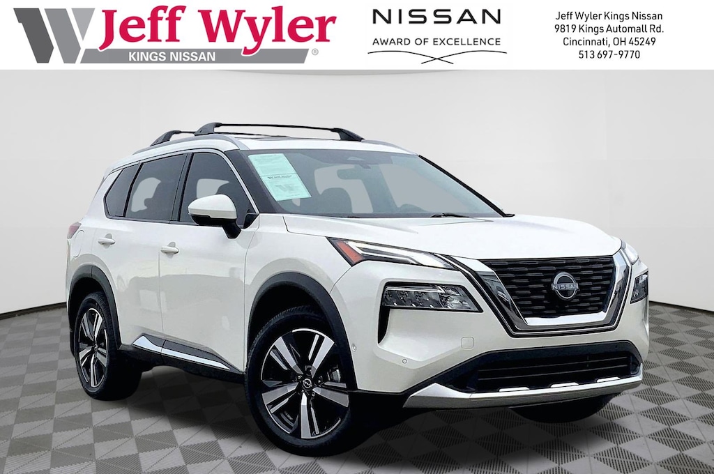 Jeff Wyler Kings Nissan is delighted to offer this outstanding-looking 2023 Nissan Rogue Platinum in Pearl White Tricoat. Well equipped with: Platinum Premium Package (Heads-Up Display, Rear Heated Seats, and Tri-Zone HVAC), AWD, 10 Speakers, 19" Aluminum Alloy Wheels, 4-Wheel Disc Brakes, 5.604 Axle Ratio, ABS brakes, Air Conditioning, Alloy wheels, AM/FM radio: SiriusXM, Auto High-beam Headlights, Auto-dimming Rear-View mirror, Automatic temperature control, Black Splash Guards (Set of 4), Bose Premium Audio System, Brake assist, Bumpers: body-color, Chrome Rear Bumper Protector, Delay-off headlights, Driver door bin, Driver vanity mirror, Dual front impact airbags, Dual front side impact airbags, Electronic Stability Control, Emergency communication system: NissanConnect Services, First Aid Kit, Floor Mats w/2-Piece Cargo Area Protector, Four wheel independent suspension, Frameless Rearview Mirror w/Universal Remote, Front anti-roll bar, Front Bucket Seats, Front Center Armrest, Front dual zone A/C, Front reading lights, Fully automatic headlights, Heated door mirrors, Heated Front Bucket Seats, Heated front seats, Heated steering wheel, Illuminated entry, Illuminated Kick Plates, Interior Accent Lighting, Knee airbag, Leather steering wheel, Low tire pressure warning, Memory seat, Navigation system: NissanConnect Navigation, NissanConnect featuring Apple CarPlay and Android Auto, Occupant sensing airbag, Outside temperature display, Overhead airbag, Overhead console, Panic alarm, Passenger door bin, Passenger vanity mirror, Power door mirrors, Power driver seat, Power Liftgate, Power moonroof, Power passenger seat, Power steering, Power windows, Quilted Semi-Aniline Leather Seat Trim, Radio data system, Radio: AM/FM NissanConnect w/Navigation, Rear anti-roll bar, Rear reading lights, Rear seat center armrest, Rear side impact airbag, Rear window defroster, Rear window wiper, Remote keyless entry, Security system, Speed control, Speed-Sensitive Wipers, Split folding rear seat, Spoiler, Steering wheel mounted audio controls, Tachometer, Telescoping steering wheel, Tilt steering wheel, Traction control, Trip computer, Turn signal indicator mirrors, and Variably intermittent wipers.Ask about available certifications.