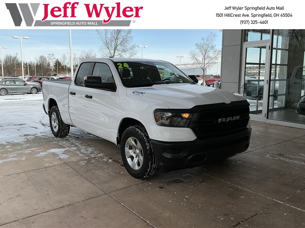 Jeff Wyler Springfield Auto Mall is pumped up to offer this great 2024 Ram 1500 Tradesman in Bright White Clearcoat. Well equipped with: Quick Order Package 23A Tradesman, Tradesman Level 1 Equipment Group (3 Rear Seat Head Restraints, 4 Way Front Headrests, 40/20/40 Split Bench Seat, Carpet Floor Covering, Cloth 40/20/40 Bench Seat, For More Info, Call 800-643-2112, Front & Rear Floor Mats, Front Center Seat Cushion Storage, Manual Adjust 4-Way Driver Seat, Manual Adjust 4-Way Front Passenger Seat, Rear Folding Seat, Rear Power Sliding Window, SiriusXM Radio Service, and SiriusXM Satellite Radio), Trailer Tow Group (4G LTE Wi-Fi Hot Spot, Apple CarPlay, Black Trailer Tow Power Mirrors, Bluetooth Handsfree Phone & Audio, Class IV Receiver Hitch, Connectivity - US/Canada, Exterior Mirrors Courtesy Lamps, Exterior Mirrors w/Heating Element, Exterior Mirrors w/Supplemental Signals, For Details, Visit DriveUconnect.com, Global Telematics Box Module (TBM), Google Android Auto, Radio: Uconnect 5 W w/8.4" Display, Trailer Brake Control, Trailer Light Check, Trailer Reverse Steering Control, Trailer Tire Pressure Monitoring System, and USB Host Flip), 3.21 Rear Axle Ratio, 4-Wheel Disc Brakes, 48V Belt Starter Generator, 6 Speakers, ABS brakes, Air Conditioning, AM/FM radio, Anti-Spin Differential Rear Axle, Brake assist, Compass, Delay-off headlights, Driver door bin, Dual front impact airbags, Dual front side impact airbags, Electronic Stability Control, Emergency communication system: RAM Connect, Front anti-roll bar, Front Center Armrest, Front License Plate Bracket, Front reading lights, Front wheel independent suspension, Fully automatic headlights, Heated door mirrors, Heavy Duty Vinyl 40/20/40 Split Bench Seat, Illuminated entry, Low tire pressure warning, Occupant sensing airbag, Outside temperature display, Overhead airbag, Overhead console, Panic alarm, ParkView Rear Back-Up Camera, Passenger door bin, Passenger vanity mirror, Power door mirrors, Power steering, Power windows, Radio data system, Radio: Uconnect 3 w/5" Display, Rear anti-roll bar, Rear step bumper, Remote keyless entry, Speed control, Tachometer, Telescoping steering wheel, Tilt steering wheel, Traction control, Variably intermittent wipers, Voltmeter, Wheels: 18" x 7.5" Steel Painted, and Wheels: 18" x 8" Cast-Aluminum PainteD. Ask about available certifications. Used vehicles 10 years of age or newer with less than 100,000 miles are eligible for the Wyler Assurance Program, but eligible vehicles must pass our reconditioning process and multi-point inspection. Provided the vehicle passes inspection, vehicles will be eligible for the 6 month/6,000 mile limited warranty. The 6 month/6,000 mile limited warranty is NOT available on AS-IS vehicles, wholesale vehicles, lease buyback/pass-thru vehicles or un-inspected vehicles. Note that this program can also apply to vehicles where the remaining factory coverage is less than 6 months or 6,000 miles. Please check the Federal Trade Commission (FTC) Buyers guide on the vehicle for full details as to whether or not warranty coverage may apply. Contact Dealer for additional details. The Wyler Assurance 6 month/6,000 Mile limited warranty ends 6 months from the date of the Retail Purchase Agreement (BUYERS ORDER) or when the vehicle's odometer registers 6,000 additional miles to the mileage listed on the BUYERS ORDER, whichever comes first. Your Deductible - The warranty holder on your contract pays the first $100 of each covered repair.