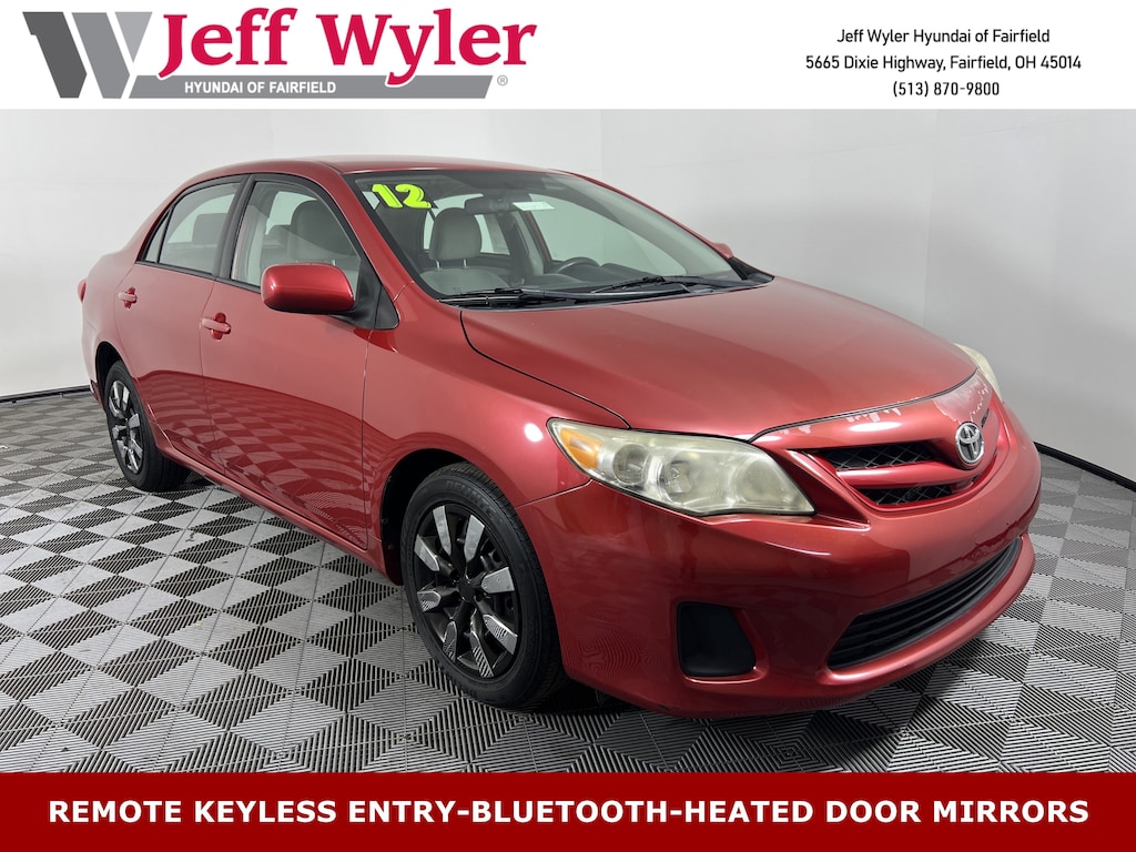 Jeff Wyler Hyundai of Fairfield is very proud to offer this terrific-looking 2012 Toyota Corolla LE in Barcelona Red Metallic. Well equipped with: Android Auto, Apple CarPlay, CALL NOW FOR YOUR VIP APPOINTMENT 513-870-9800, FULLY SERVICED w/RECORDS, GUARANTEED FINANCING!! NO MATTER YOUR SITUATION WE CAN GET AN APPROVAL!!, THE #1 Volume dealer in the region! Come see why for yourself Today!!, WE PAY MORE FOR YOUR TRADE!!, ABS brakes, Air Conditioning, AM/FM radio, Anti-whiplash front head restraints, Brake assist, Bumpers: body-color, CD player, Driver door bin, Driver vanity mirror, Dual front impact airbags, Dual front side impact airbags, Electronic Stability Control, Fabric Seat Trim, Front anti-roll bar, Front Bucket Seats, Front Center Armrest, Front reading lights, Front wheel independent suspension, Illuminated entry, Low tire pressure warning, Occupant sensing airbag, Outside temperature display, Overhead airbag, Panic alarm, Passenger door bin, Passenger vanity mirror, Power door mirrors, Power steering, Power windows, Radio: AM/FM/CD w/MP3/WMA Playback & 6 Speakers, Rear anti-roll bar, Rear window defroster, Remote keyless entry, Speed-sensing steering, Split folding rear seat, Tachometer, Telescoping steering wheel, Tilt steering wheel, Traction control, and Trip computer. TO CHECK ON THE AVAILABILITY OF THIS VEHICLE REACH OUT TO ONE OF OUR TEAM MEMBERS!! ALSO SHOP ONLINE AT https://www.jeffwylerhyundaioffairfield.com/ Proudly Serving: Cincinnati, Dayton, Columbus, Louisville, Lexington, Indianapolis, Hamilton, Florence, Alexandria, Beavercreek, Springdale, West Chester, Monroe, Fairfield, Kenwood, Newport and all of greater Cincinnati Ohio, Indiana, and Northern Kentucky.