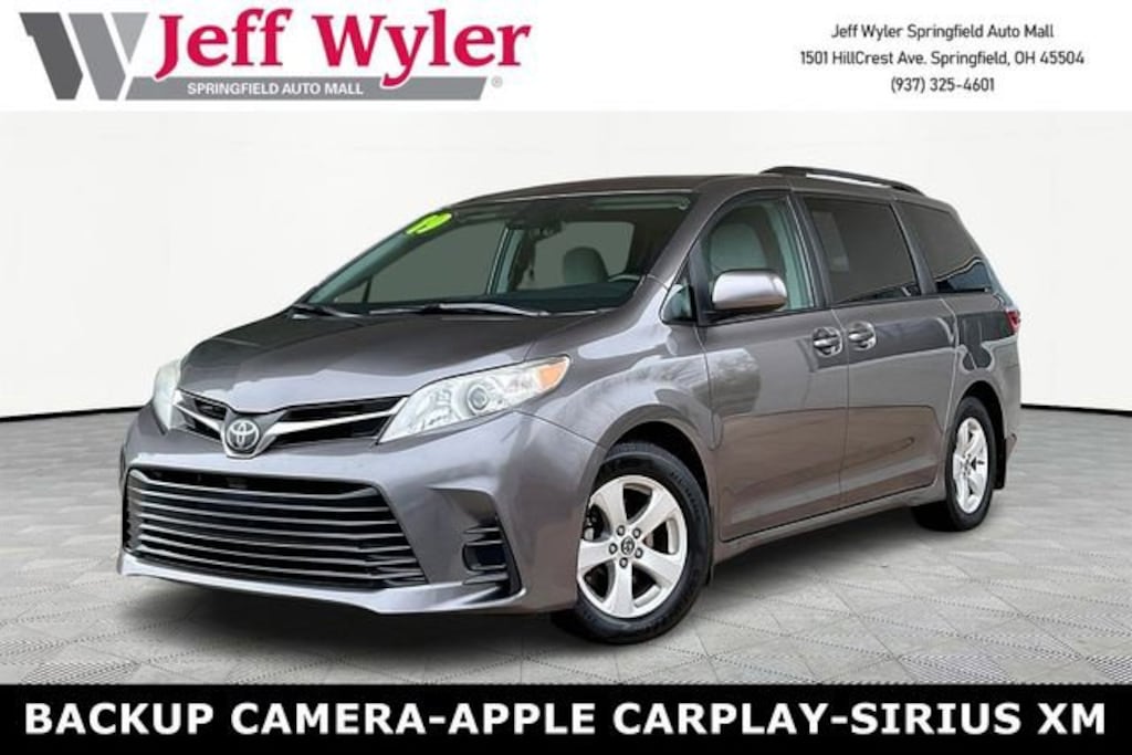 Jeff Wyler Springfield Auto Mall is very proud to offer this charming-looking 2019 Toyota Sienna LE in Gray. Well equipped with: 17 Alloy Wheels, 3rd row seats: split-bench, 4-Wheel Disc Brakes, 6 Speakers, ABS brakes, Air Conditioning, Alloy wheels, AM/FM radio: SiriusXM, Apple CarPlay, Auto High-beam Headlights, Auto-dimming Rear-View mirror, Automatic temperature control, Axle Ratio: 3.003, Brake assist, Bumpers: body-color, CD player, Compass, Convex Outside Rear View Mirror, Delay-off headlights, Door auto-latch, Driver door bin, Driver vanity mirror, Driver's Seat Mounted Armrest, Dual front impact airbags, Dual front side impact airbags, Electronic Stability Control, Exterior Parking Camera Rear, Fabric Seat Material, Front anti-roll bar, Front Bucket Seats, Front dual zone A/C, Front reading lights, Front wheel independent suspension, Fully automatic headlights, Garage door transmitter: HomeLink, Heated door mirrors, Illuminated entry, Knee airbag, Lane Change Assist, Low tire pressure warning, Occupant sensing airbag, Outside temperature display, Overhead airbag, Overhead console, Panic alarm, Passenger door bin, Passenger seat mounted armrest, Passenger vanity mirror, Power door mirrors, Power driver seat, Power steering, Power windows, Radio data system, Radio: Entune 3.0 Audio Plus, Rear air conditioning, Rear anti-roll bar, Rear reading lights, Rear seat center armrest, Rear window defroster, Rear window wiper, Reclining 3rd row seat, Remote keyless entry, Roof rack: rails only, Smart Key w/Push Button Start, Speed control, Speed-sensing steering, Split folding rear seat, Spoiler, Steering wheel mounted audio controls, Tachometer, Telescoping steering wheel, Tilt steering wheel, Traction control, Trip computer, and Variably intermittent wipers. Awards: